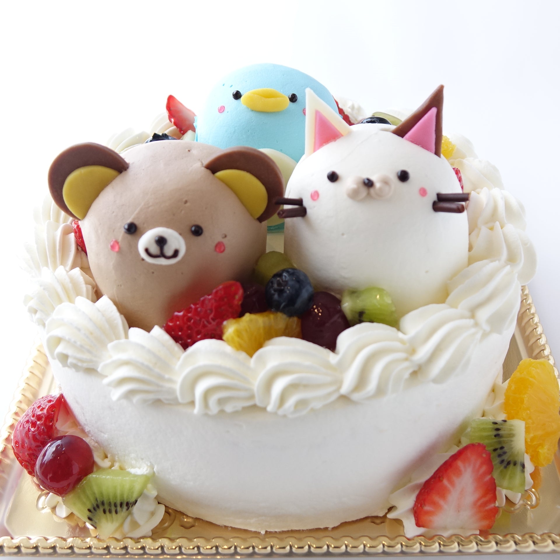 可愛い動物たちがケーキになった「どうぶつさんケーキ」を乗せた可愛らしく豪華なデコレーションケーキです。上にのせるどうぶつさんは30種類の中から自由にお選びいいただけます。