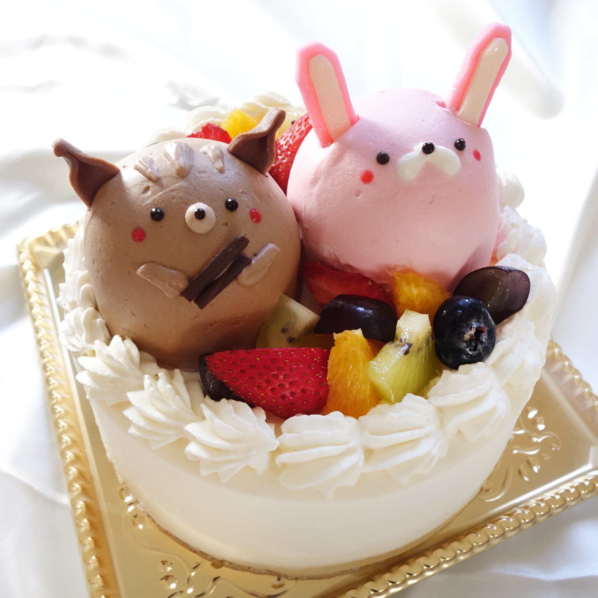 仲良く寄り添うウサギとリスの立体デコレーションが愛らしい、特別な日にぴったりのケーキです。